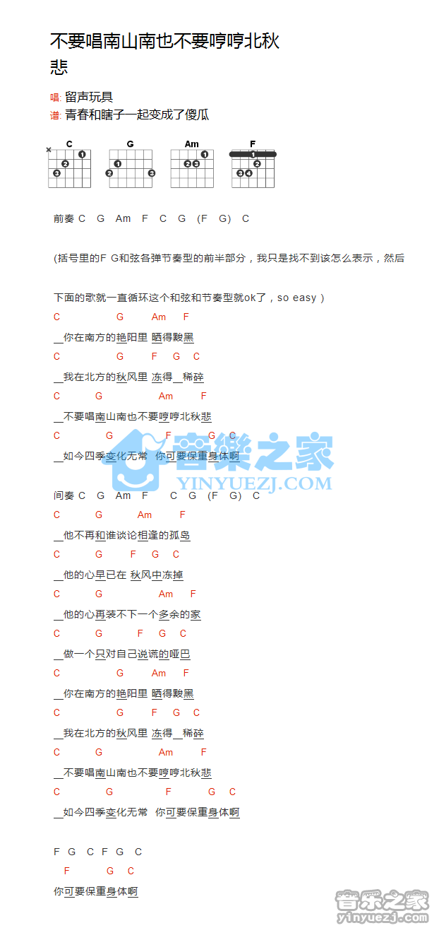 吉他留声玩具《不要唱南山南也不要哼哼北秋悲》吉他谱_吉他弹唱谱_YYZJ编配