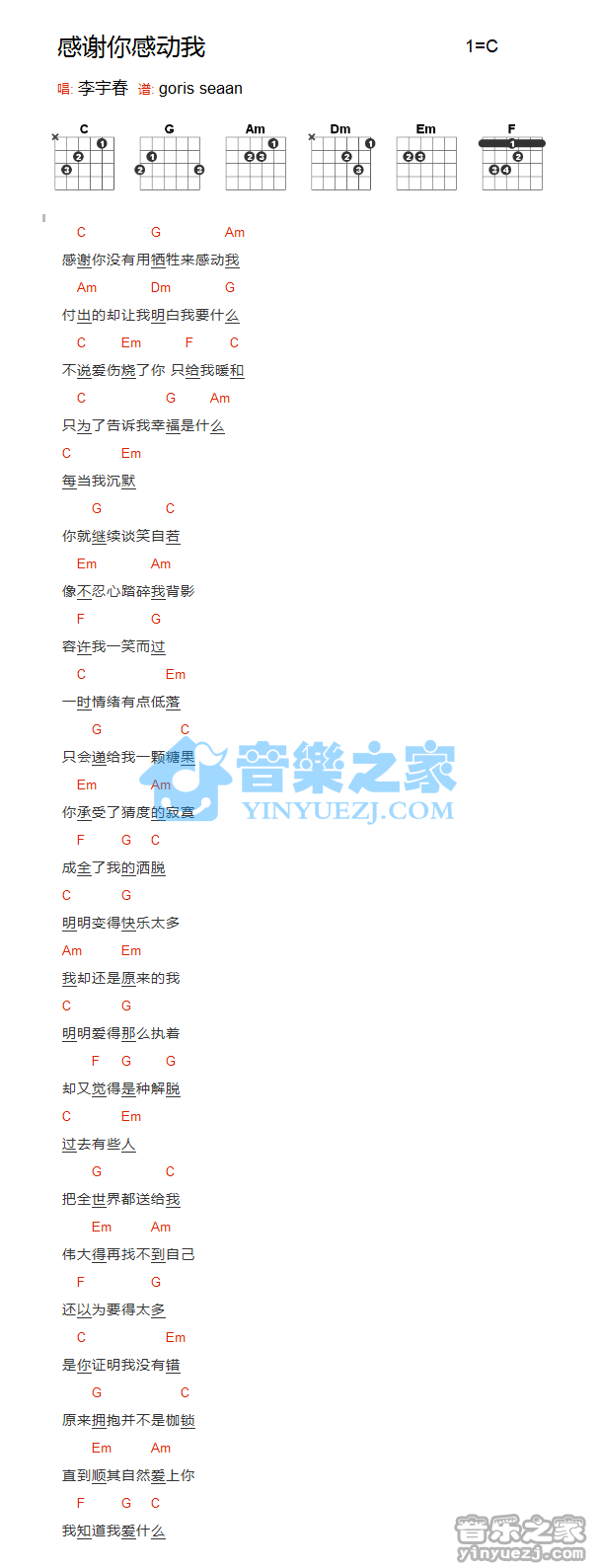 吉他李宇春《感谢你感动我》吉他谱_吉他弹唱谱_YYZJ编配