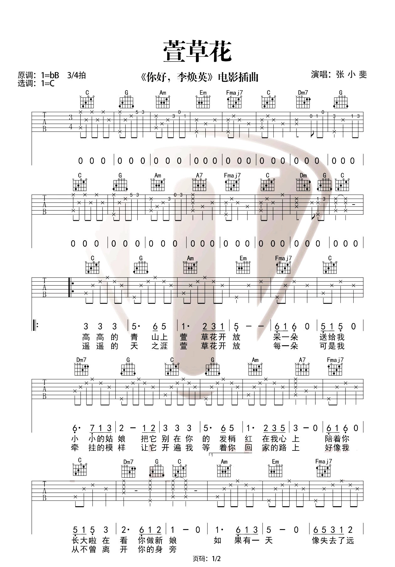 张小斐《萱草花》吉他谱,山山吉他编配出品,共有2张高清图谱,免翻页排版设计。...