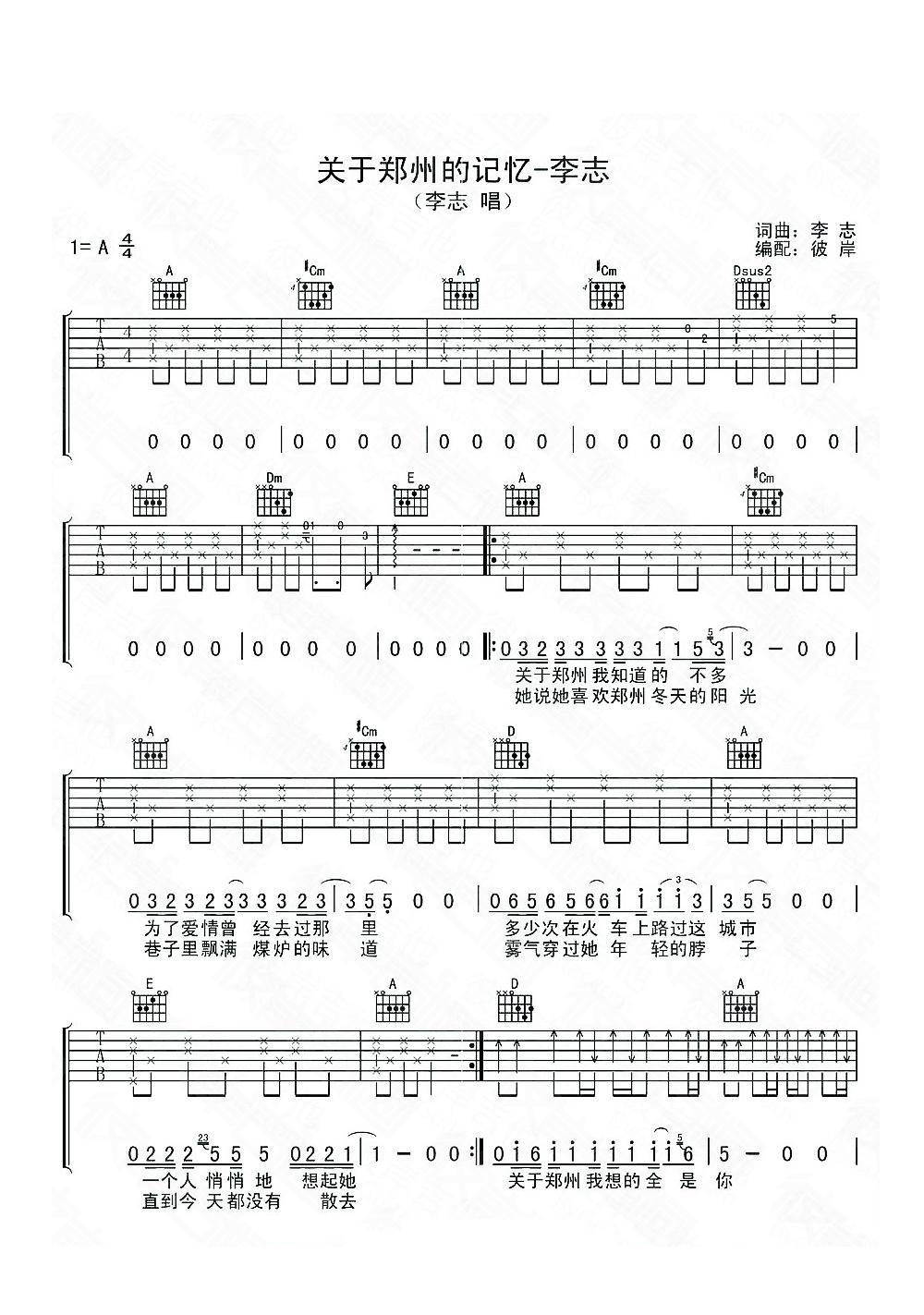 吉他李志《关于郑州的记忆》吉他谱_吉他弹唱谱_彼岸吉他编配