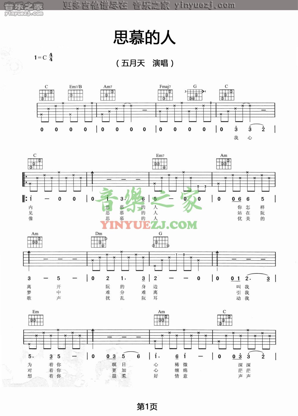 五月天《思慕的人》吉他谱,YYZJ编配出品,共有2张高清图谱,免翻页排版设计。...