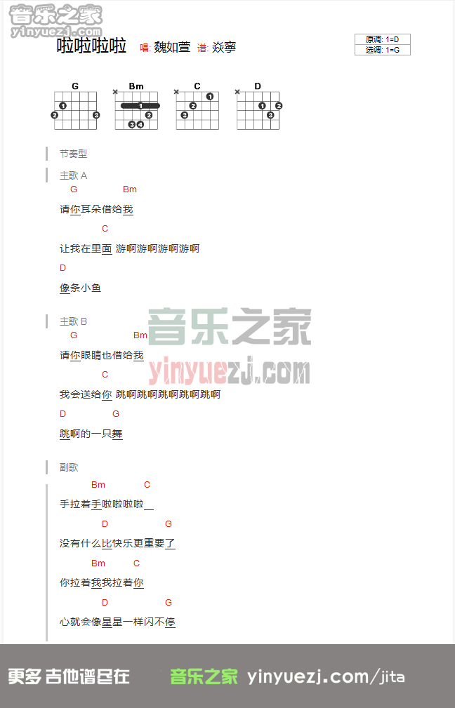 魏如萱《啦啦啦啦》吉他谱,YYZJ编配出品,共有1张高清图谱,免翻页排版设计。...