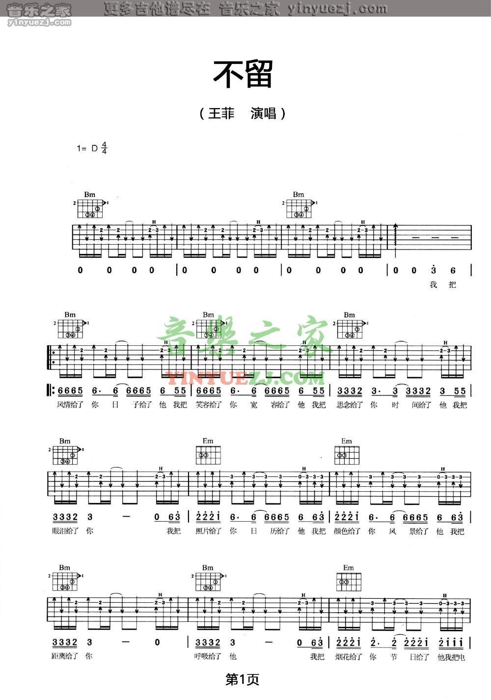 吉他王菲《不留》吉他谱_吉他弹唱谱_YYZJ编配