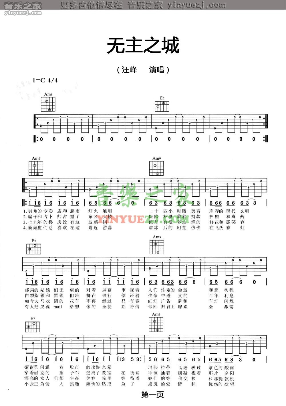 吉他汪峰《无主之城》吉他谱_吉他弹唱谱_YYZJ编配