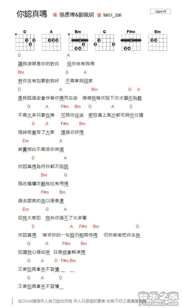 吉他张彦博/刘佩玥《你认真吗》吉他谱_吉他弹唱谱_YYZJ编配