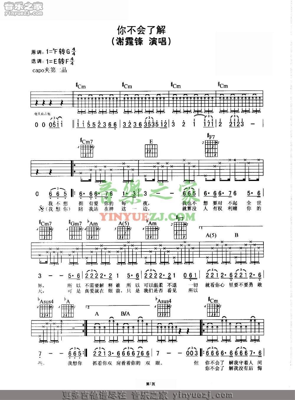 谢霆锋《你不会了解》吉他谱,YYZJ编配出品,共有3张高清图谱。...