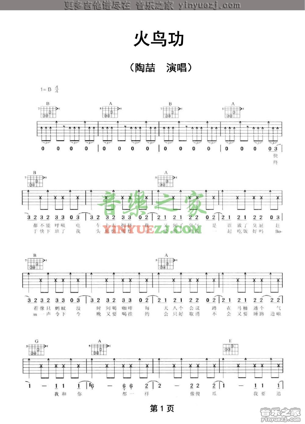 陶喆《火鸟功》吉他谱,YYZJ编配出品,共有2张高清图谱,免翻页排版设计。...