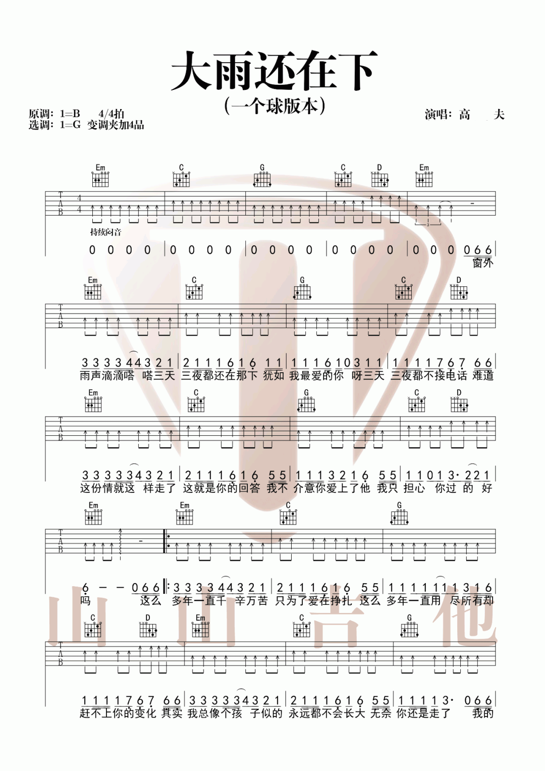 吉他一个球《大雨还在下》吉他谱_吉他弹唱谱_山山吉他编配