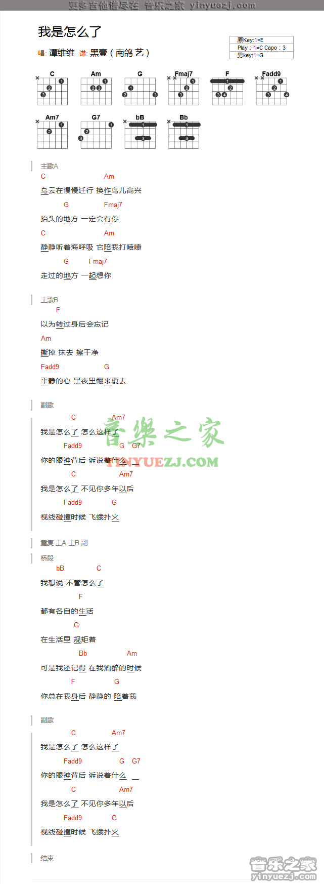 吉他谭维维《我是怎么了》吉他谱_吉他弹唱谱_YYZJ编配