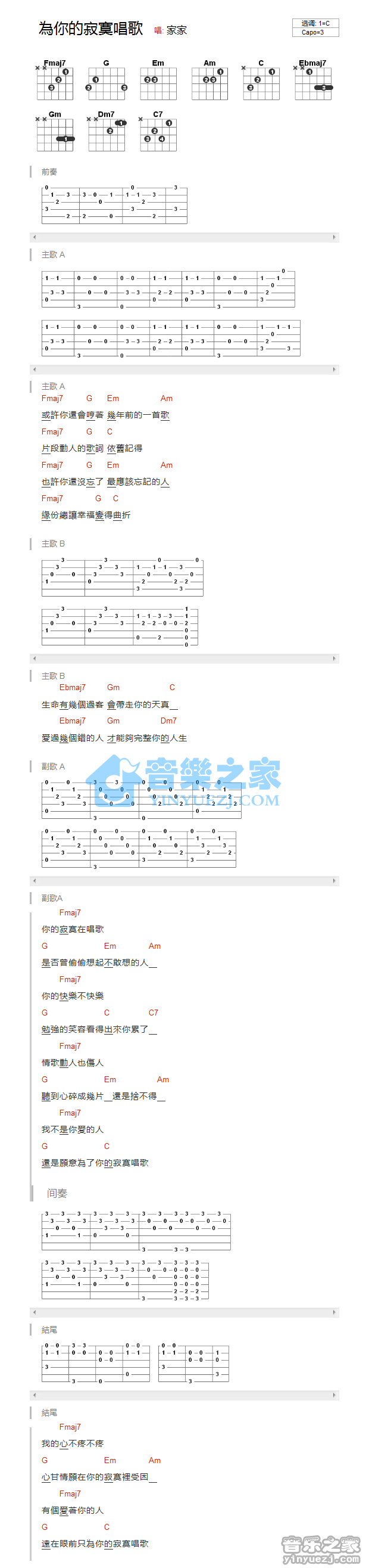 吉他家家《为你的寂寞唱歌》吉他谱_吉他弹唱谱_YYZJ编配