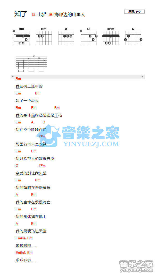 老猫《知了》吉他谱,YYZJ编配出品,共有1张高清图谱,免翻页排版设计。...