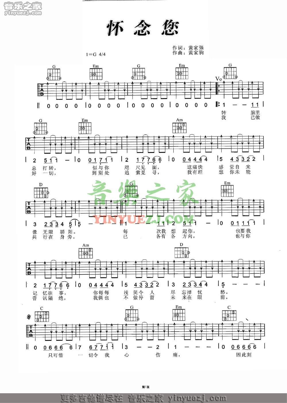 吉他Beyond《怀念您》吉他谱_吉他弹唱谱_YYZJ编配