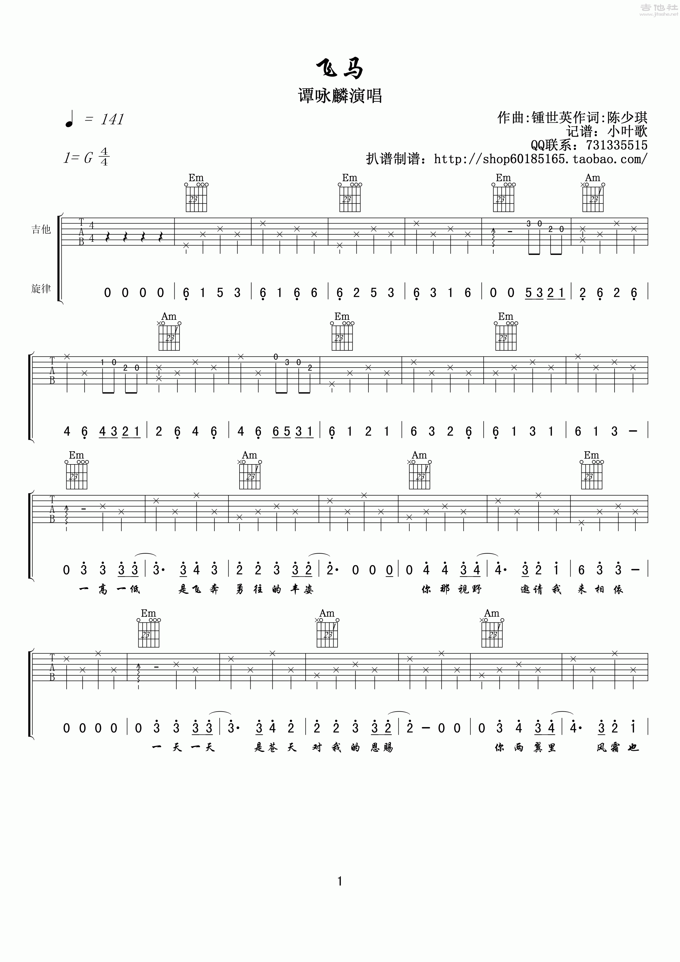 吉他谭咏麟《飞马》吉他谱_吉他弹唱谱_小叶歌编配
