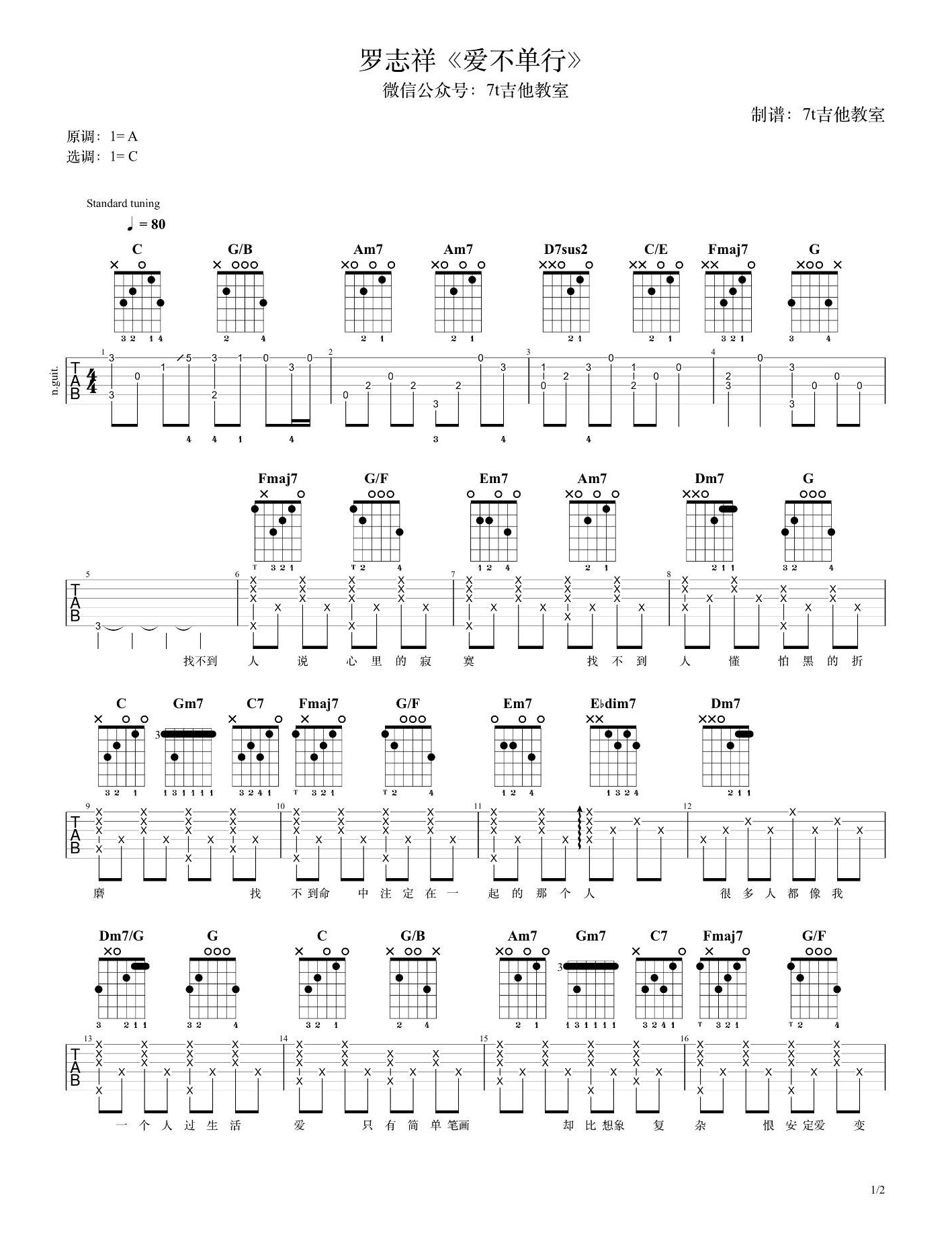 罗志祥《爱不单行》吉他谱,7t音乐教室编配出品,共有2张高清图谱,免翻页排版设计。...