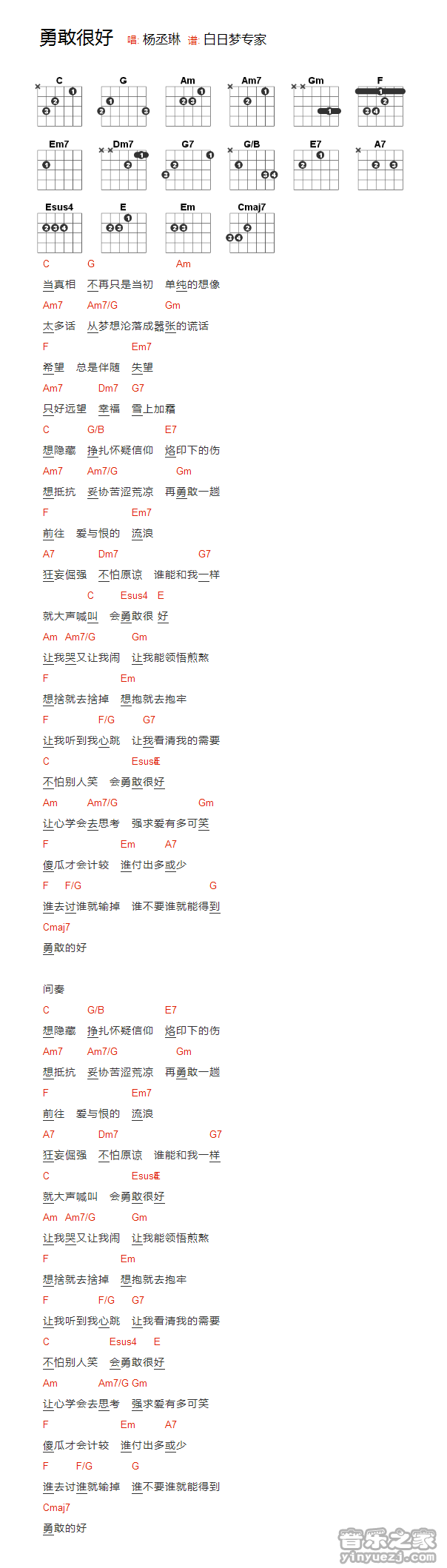 吉他杨丞琳《勇敢很好》吉他谱_吉他弹唱谱_YYZJ编配