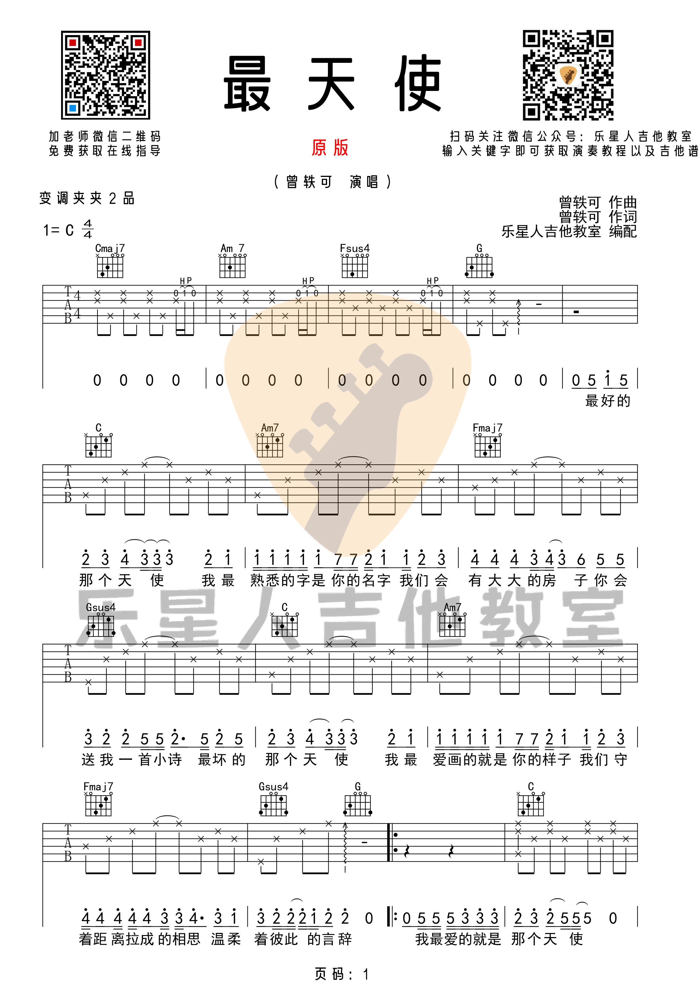 吉他曾轶可《最天使》吉他谱_吉他弹唱谱_乐星人吉他教室编配