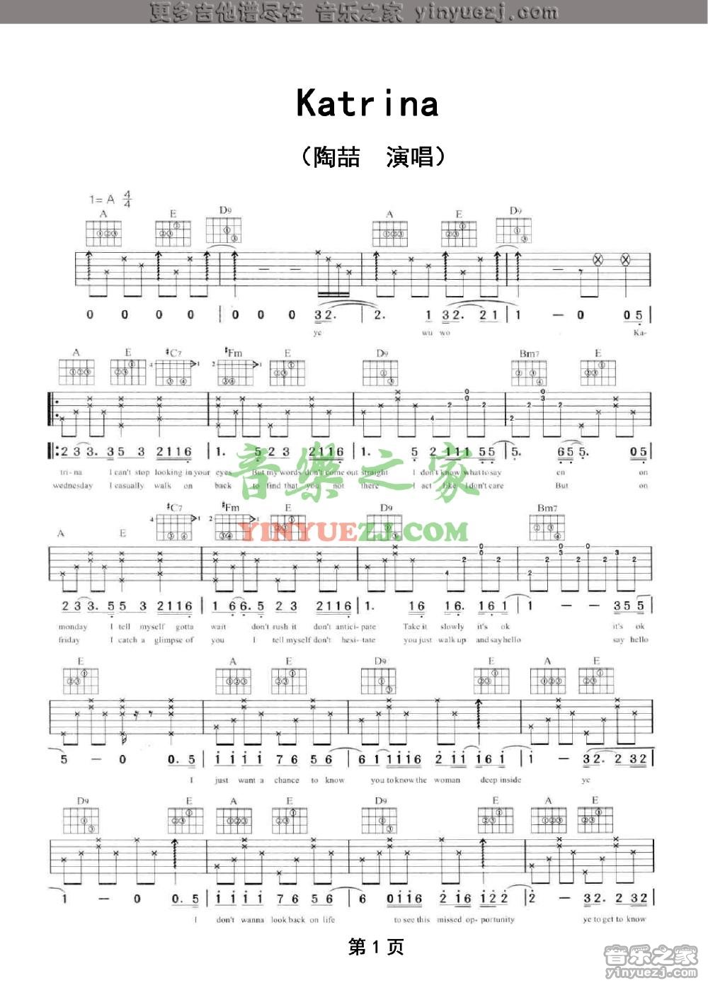 陶喆《Katrina》吉他谱,YYZJ编配出品,共有2张高清图谱,免翻页排版设计。...