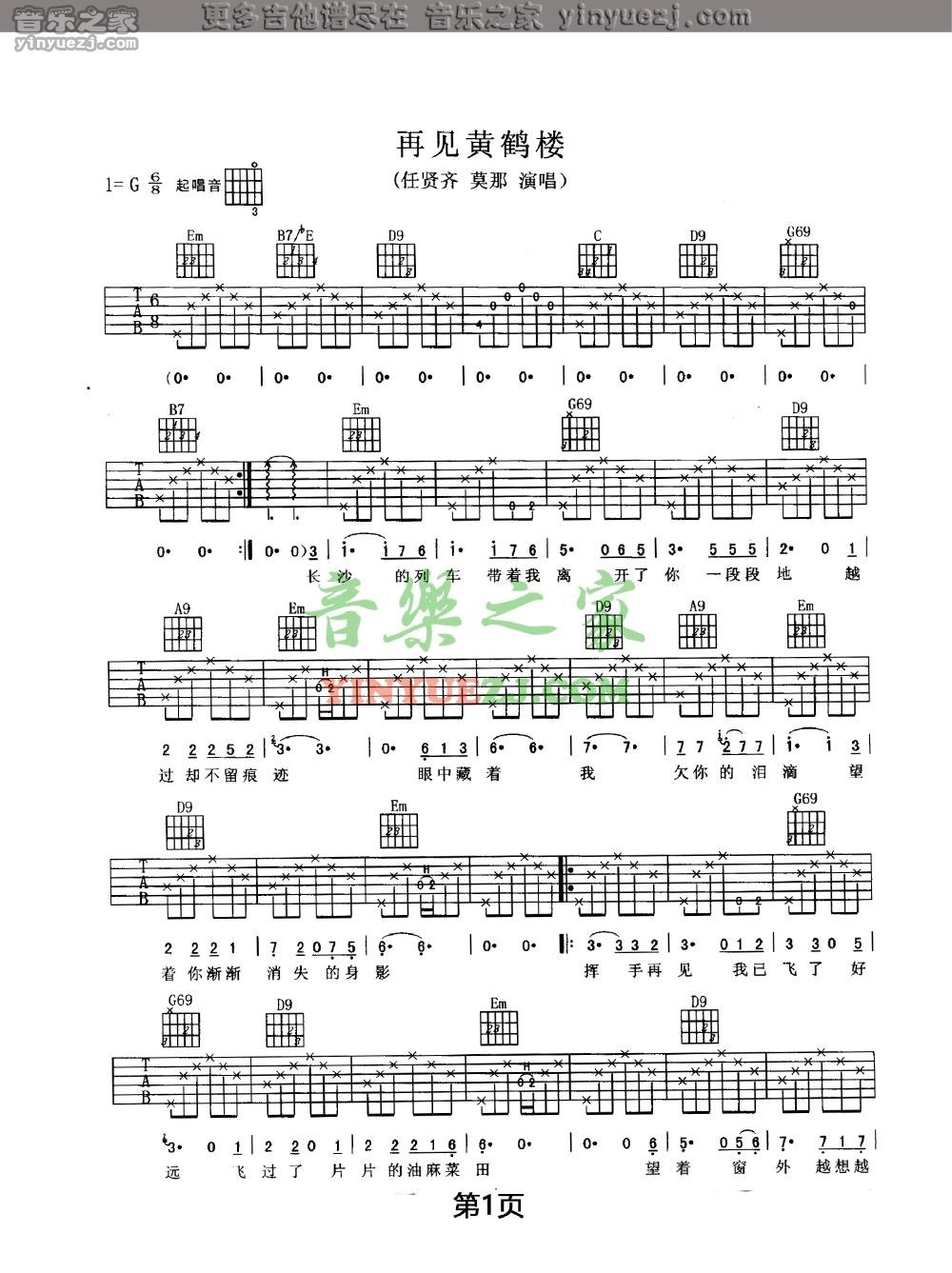 吉他任贤齐《再见黄鹤楼》吉他谱_吉他弹唱谱_YYZJ编配