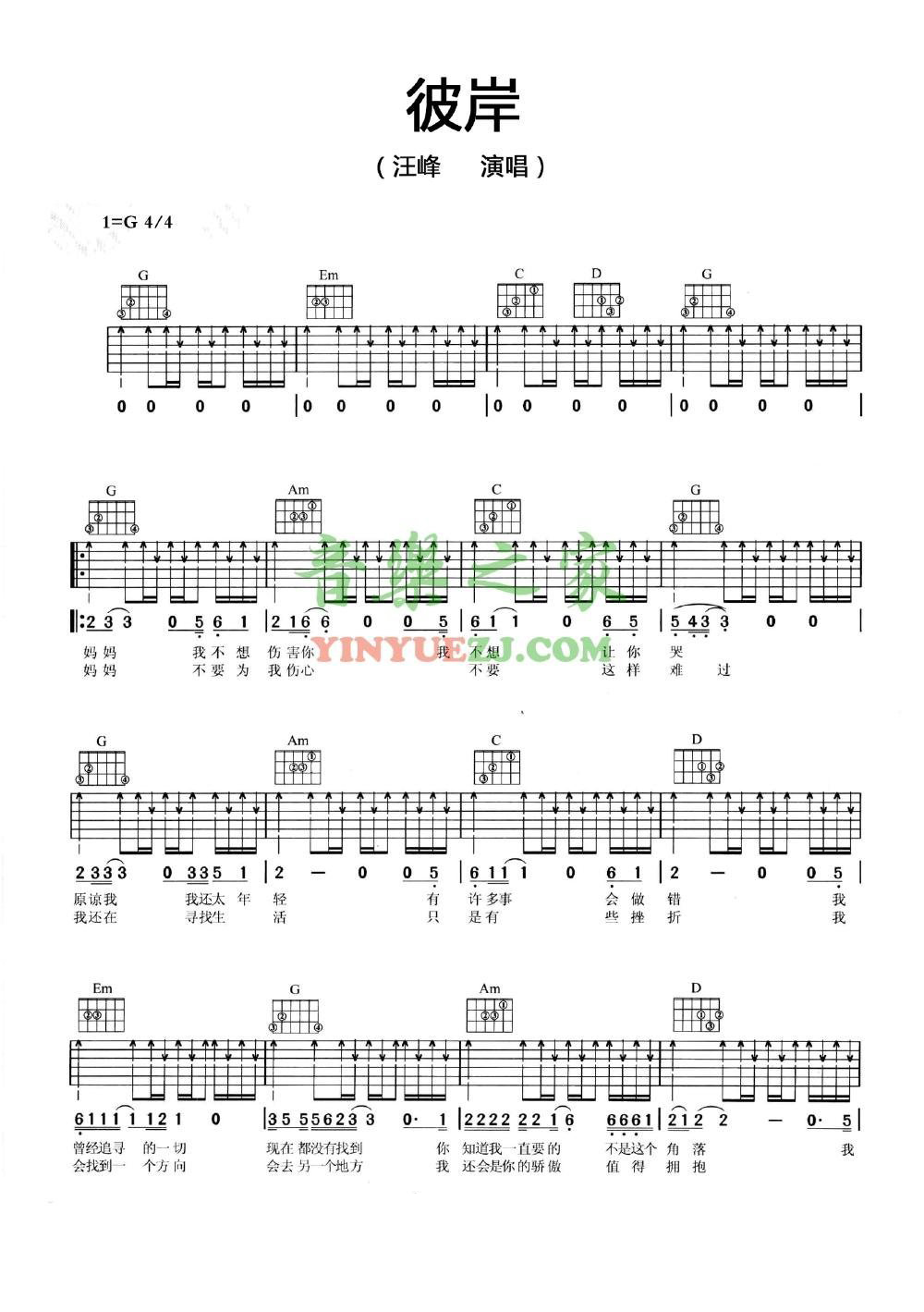 吉他汪峰《彼岸》吉他谱_吉他弹唱谱_YYZJ编配