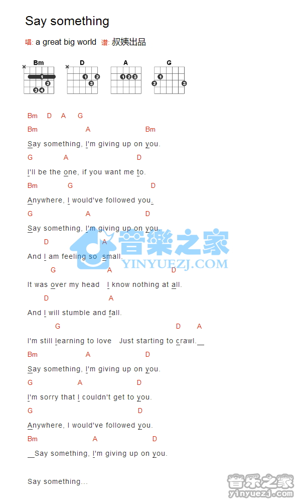 吉他Christina María Aguilera《Say something》吉他谱_吉他弹唱谱_YYZJ编配