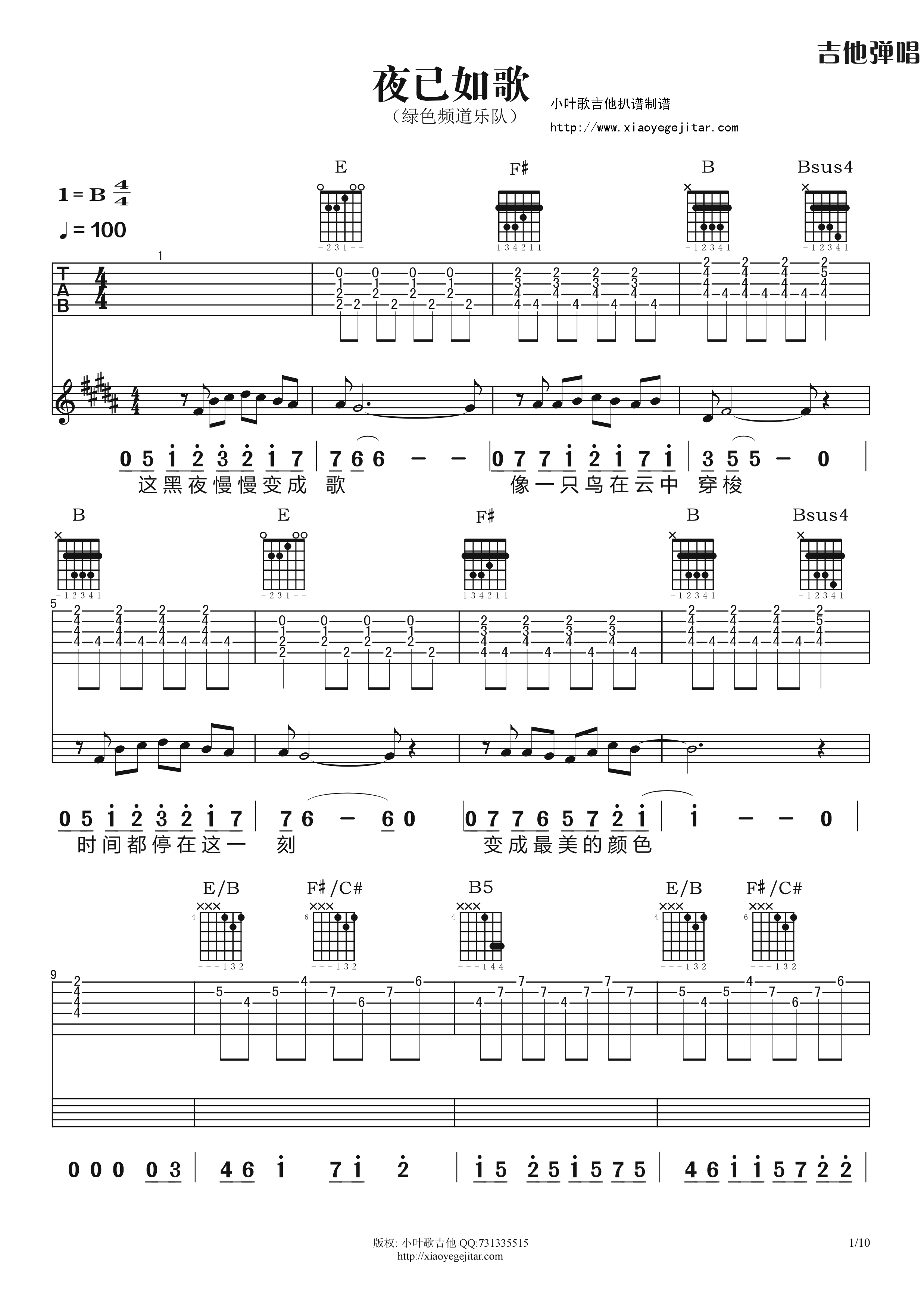 绿色频道《夜已如歌》吉他谱,小叶歌编配出品,共有10张高清图谱。...