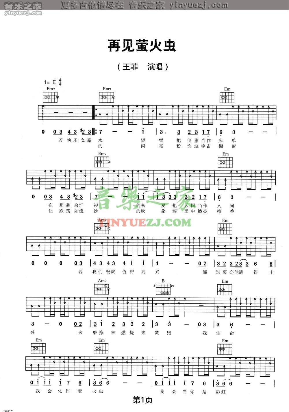 王菲《再见萤火虫》吉他谱,YYZJ编配出品,共有2张高清图谱,免翻页排版设计。...