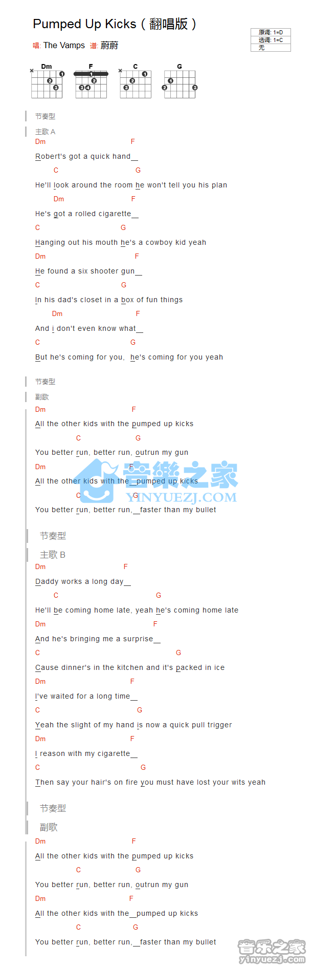 吉他TheVamps《Pumped Up Kicks》吉他谱_吉他弹唱谱_YYZJ编配