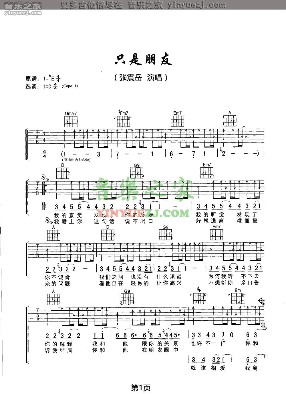 张震岳《只是朋友》吉他谱,YYZJ编配出品,共有2张高清图谱,免翻页排版设计。...