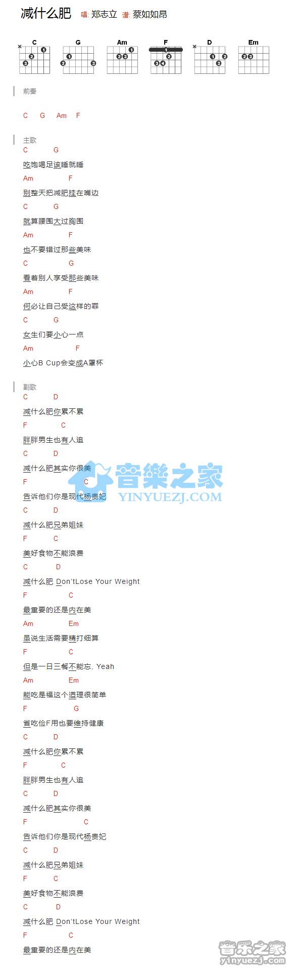 吉他郑志立《减什么肥》吉他谱_吉他弹唱谱_YYZJ编配