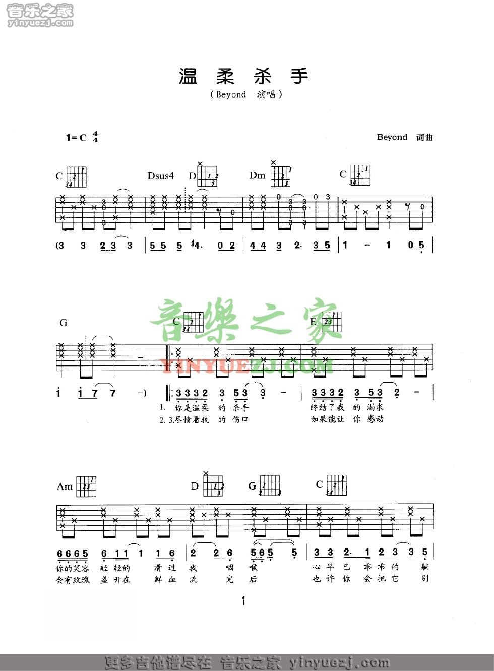 吉他Beyond《温柔杀手》吉他谱_吉他弹唱谱_YYZJ编配