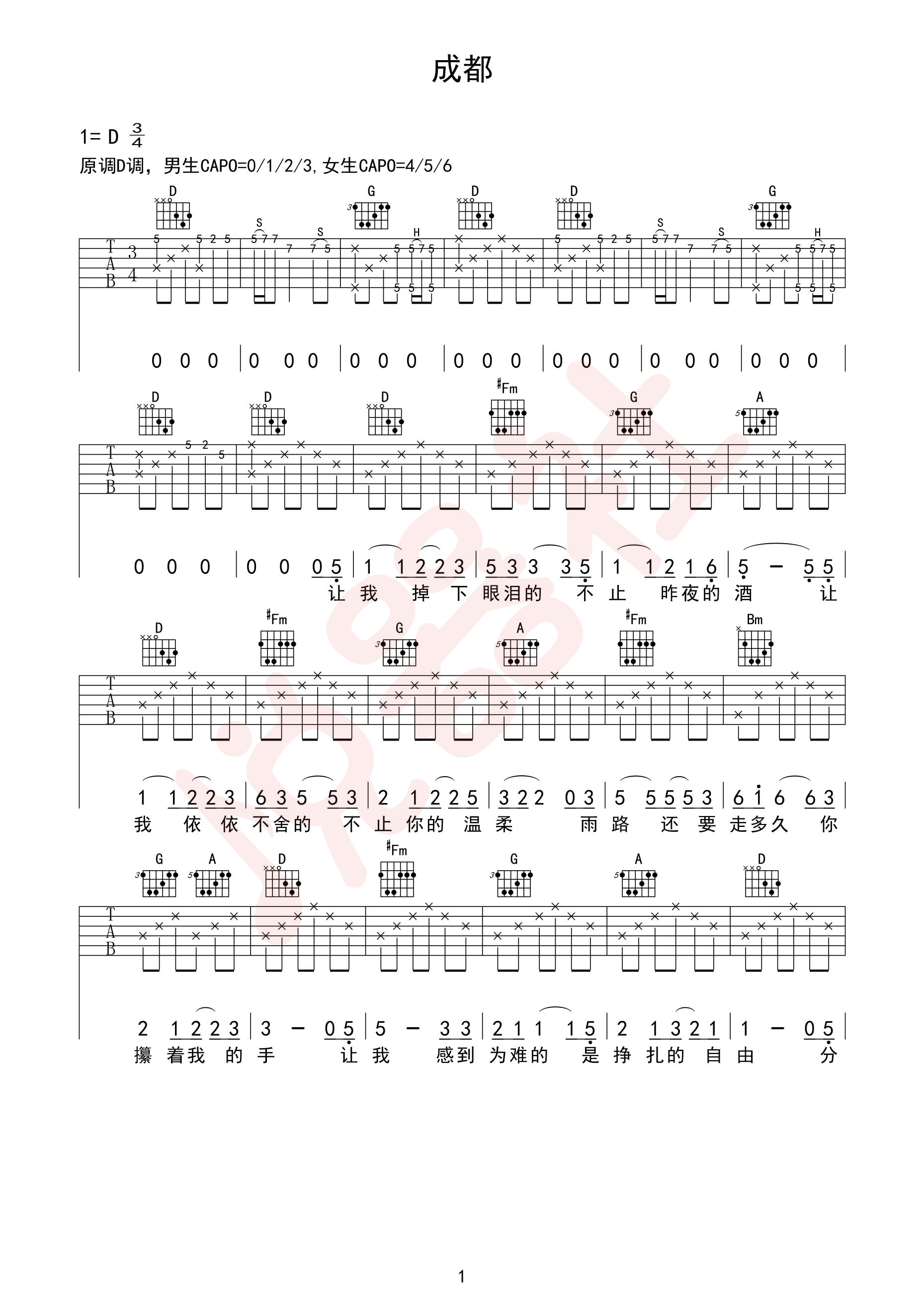 赵雷《成都》吉他谱_D调吉他弹唱谱...