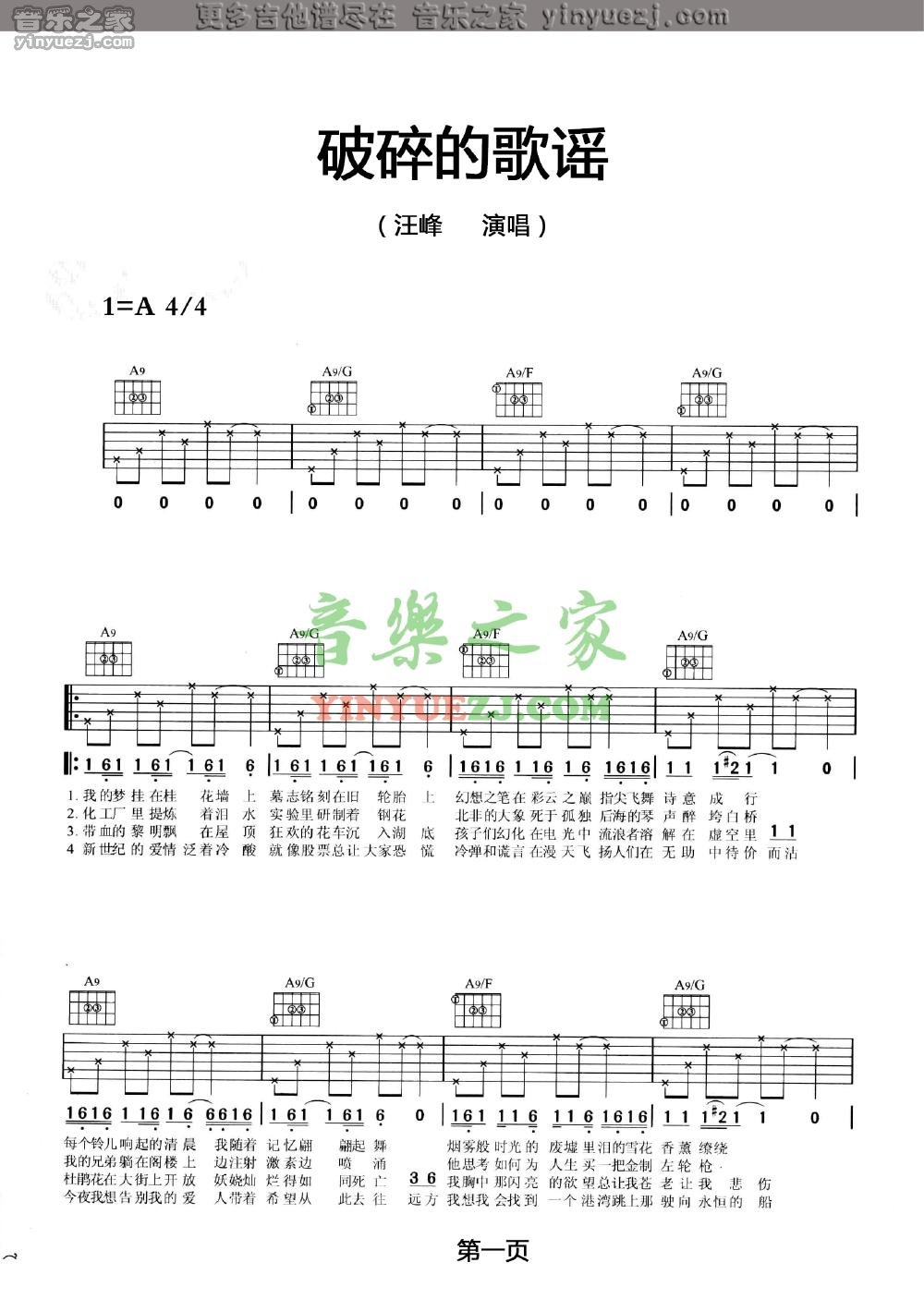 汪峰《破碎的歌谣》吉他谱,YYZJ编配出品,共有2张高清图谱,免翻页排版设计。...