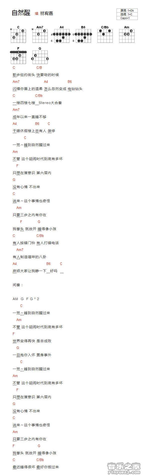 吉他林宥嘉《自然醒》吉他谱_吉他弹唱谱_YYZJ编配