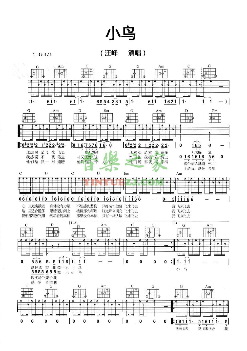 吉他汪峰《小鸟》吉他谱_吉他弹唱谱_YYZJ编配