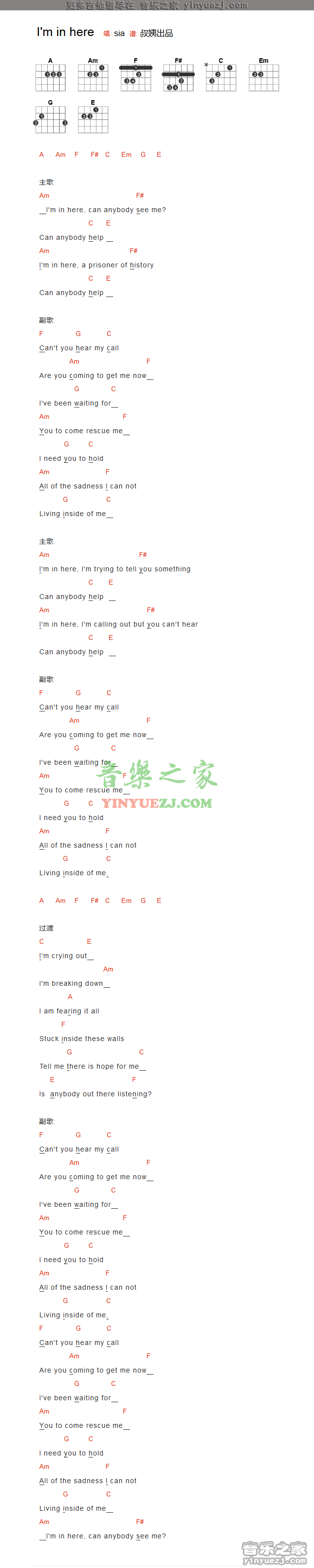 吉他Sia《I'm In Here》吉他谱_吉他弹唱谱_YYZJ编配