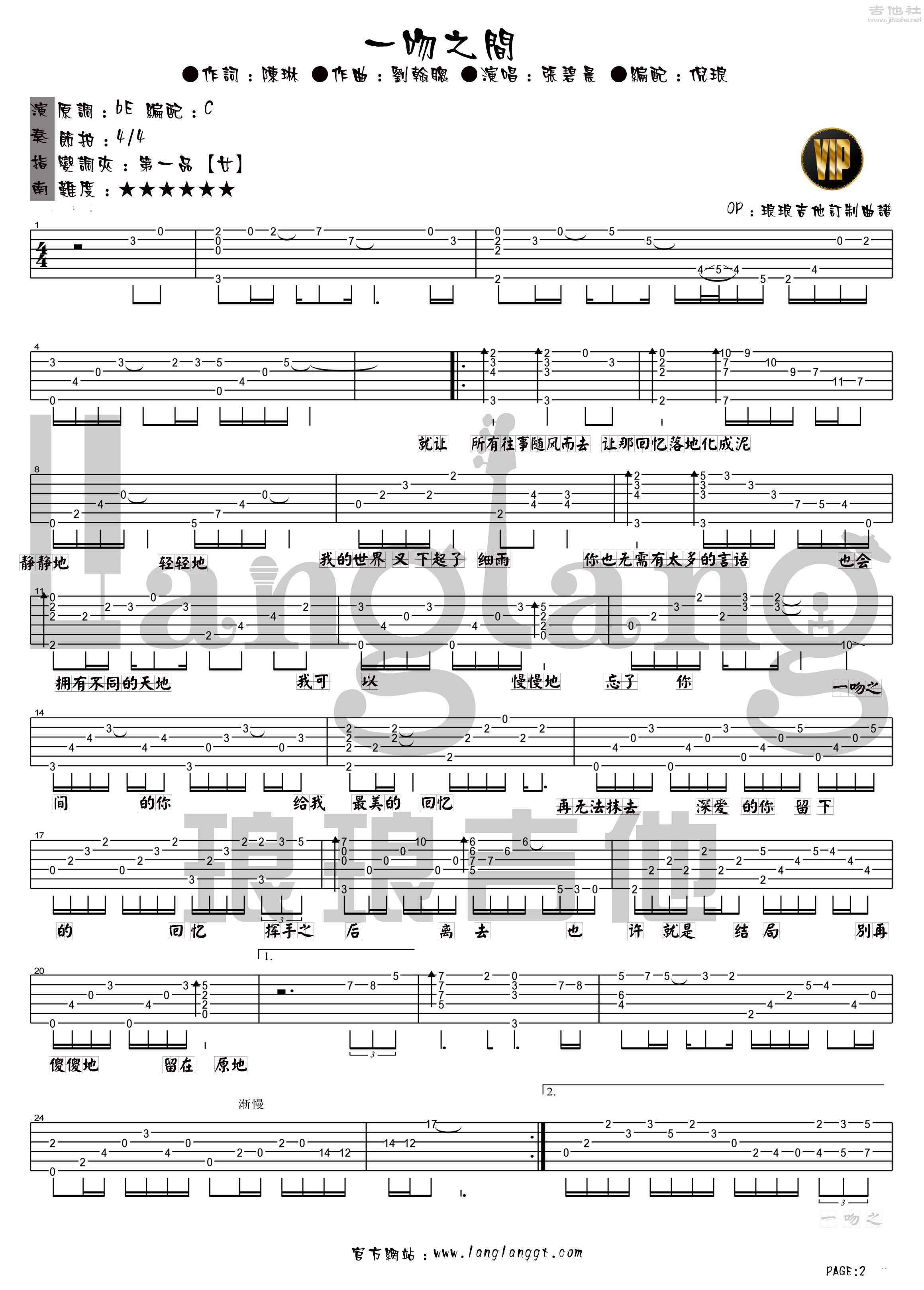 张碧晨《一吻之间》吉他谱,琅琅编配出品,共有2张高清图谱,免翻页排版设计。...