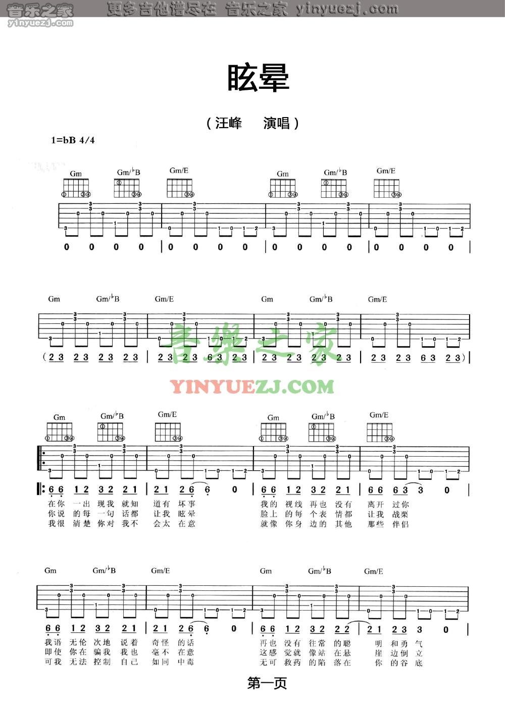 汪峰《眩晕》吉他谱,YYZJ编配出品,共有2张高清图谱,免翻页排版设计。...