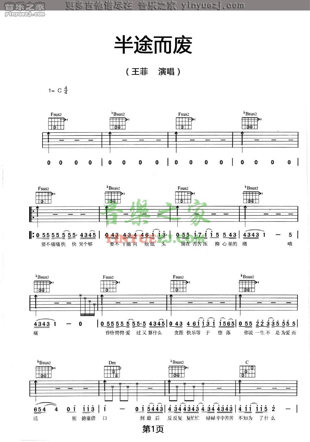 王菲《半途而废》吉他谱,YYZJ编配出品,共有2张高清图谱,免翻页排版设计。...