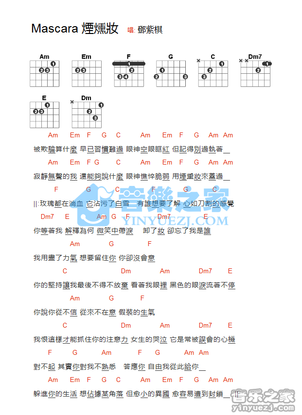 吉他邓紫棋《Mascara (烟熏妆)》吉他谱_吉他弹唱谱_YYZJ编配