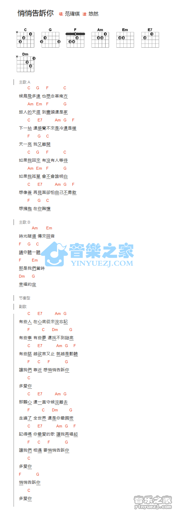 吉他范玮琪《悄悄告诉你》吉他谱_吉他弹唱谱_YYZJ编配
