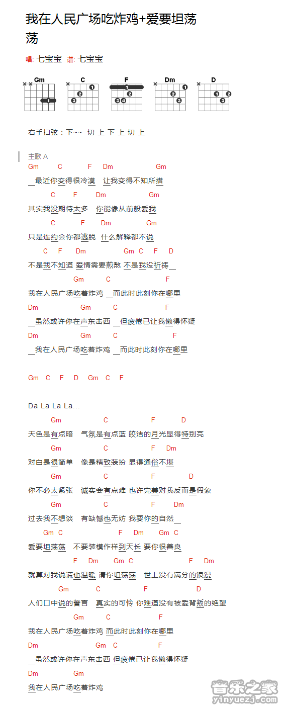 七宝宝《我在人民广场吃炸鸡+爱要坦荡荡》吉他谱,YYZJ编配出品,共有1张高清图谱,免翻页排版设计。...