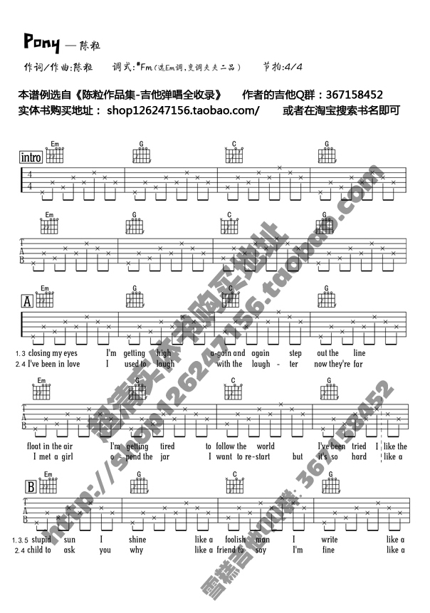 吉他陈粒《pony》吉他谱_吉他弹唱谱_十万吉他手编配