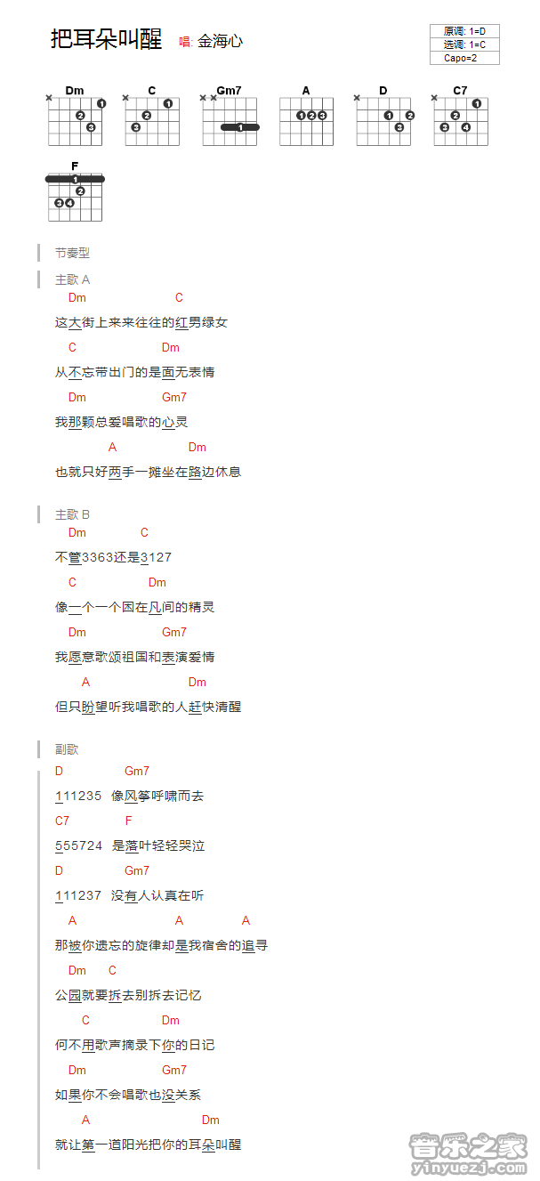 吉他金海心《把耳朵叫醒》吉他谱_吉他弹唱谱_YYZJ编配