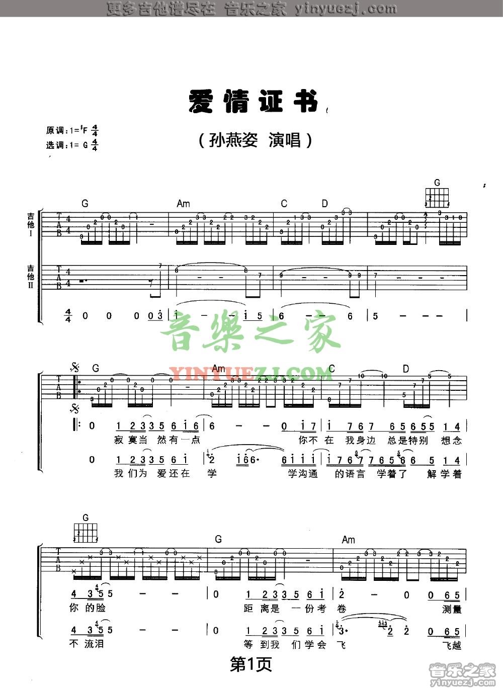 孙燕姿《爱情证书》吉他谱,YYZJ编配出品,共有4张高清图谱。...