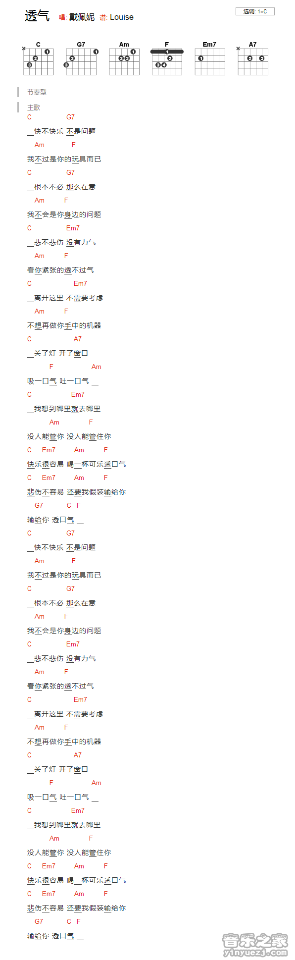 吉他戴佩妮《透气》吉他谱_吉他弹唱谱_YYZJ编配