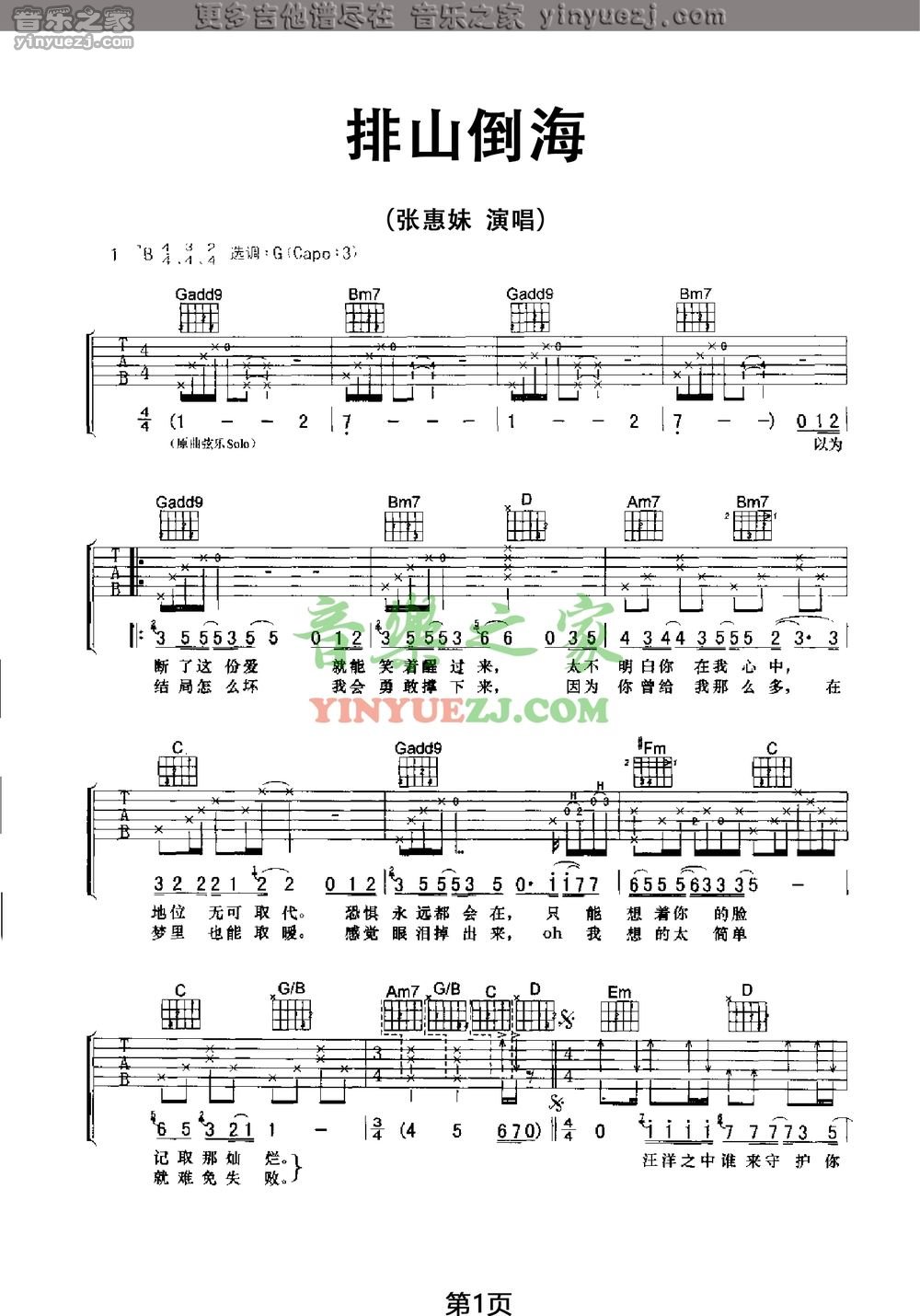 吉他张惠妹《排山倒海》吉他谱_吉他弹唱谱_YYZJ编配