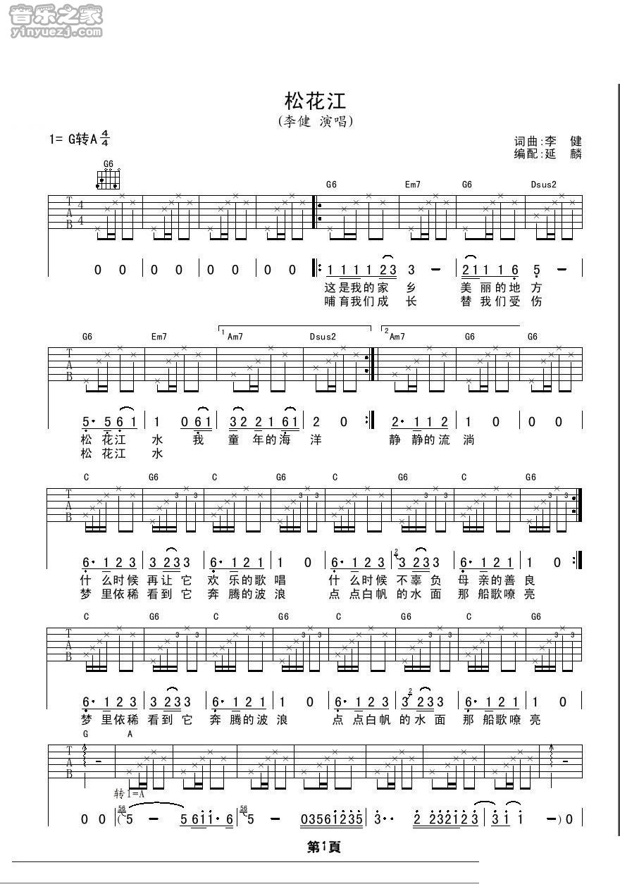 李健《松花江》吉他谱,YYZJ编配出品,共有2张高清图谱,免翻页排版设计。...