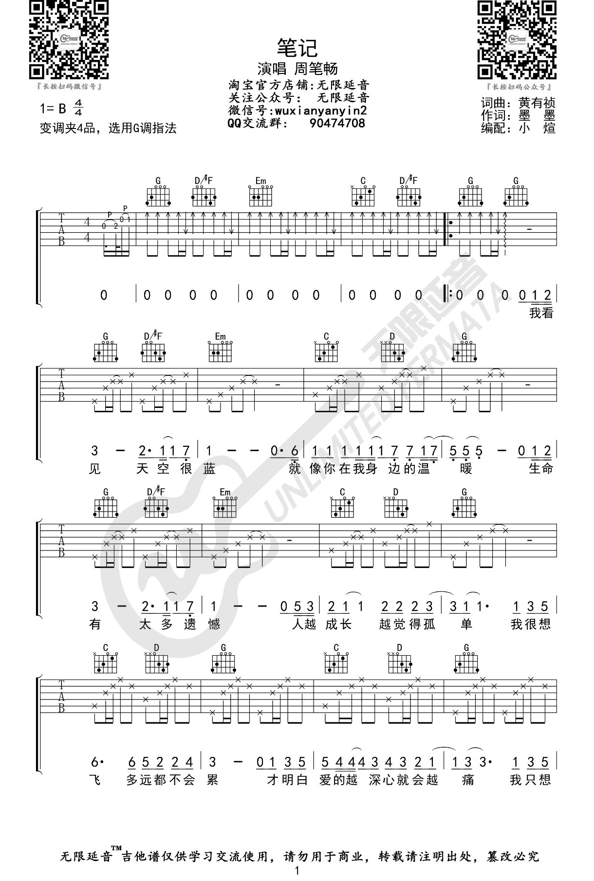 吉他周笔畅《笔记》吉他谱_吉他弹唱谱_无限延音编配