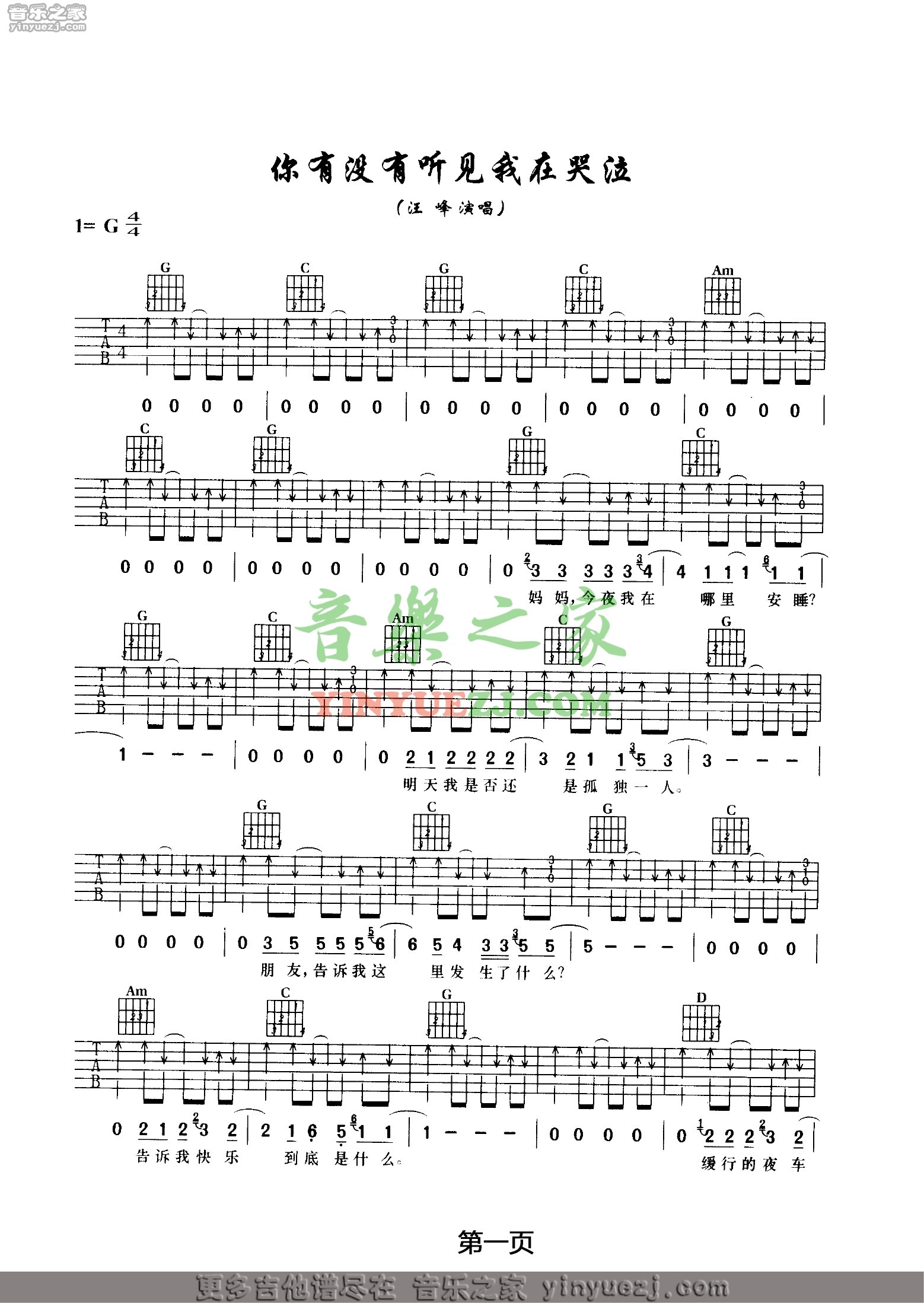汪峰《你有没有听见我在哭泣》吉他谱,YYZJ编配出品,共有5张高清图谱。...