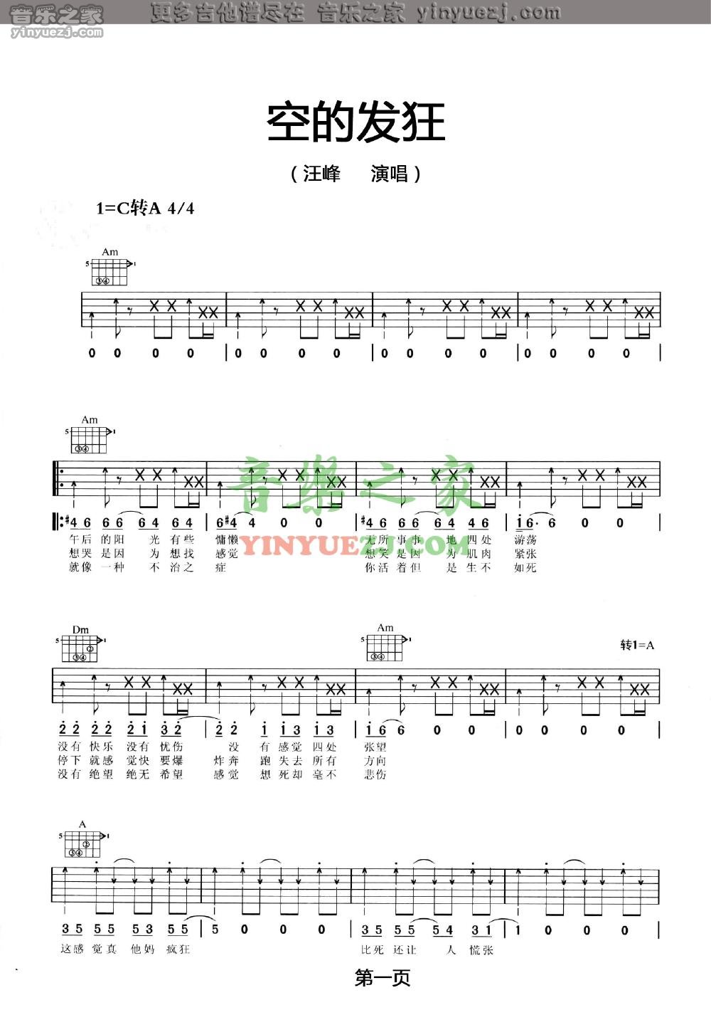 吉他汪峰《空的发狂》吉他谱_吉他弹唱谱_YYZJ编配
